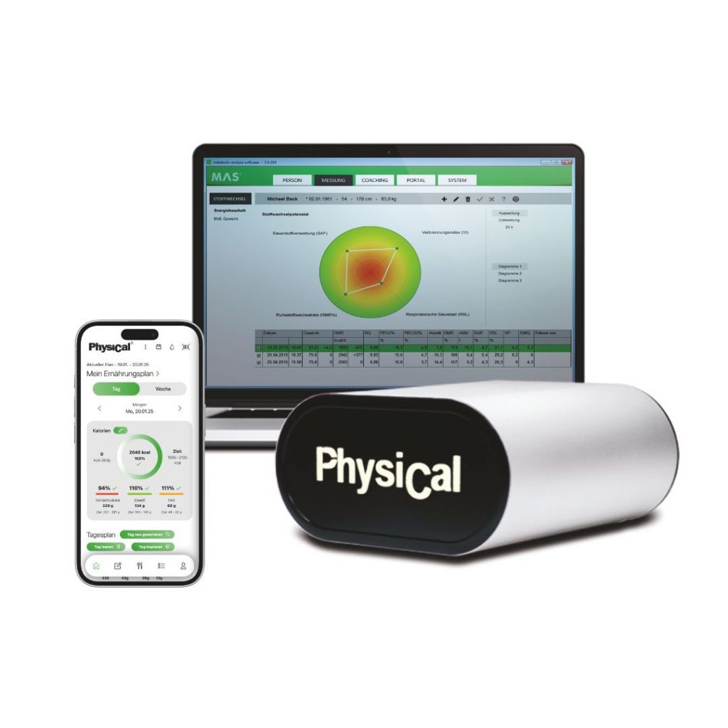 Der PhysiCal® analysiert präzise Ihren individuellen Stoffwechselzustand und zeigt auf, wie effizient Ihr Körper Fett verbrennt, was zu gezielter Gewichtsregulation und spürbar mehr Energie im Alltag führt.